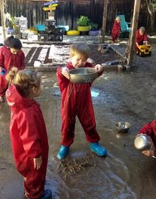 Rainy Days: Children wear Muddy Buddy suits (provided by us) and bring their own rain boots for joyful puddle jumping and muddy adventures.